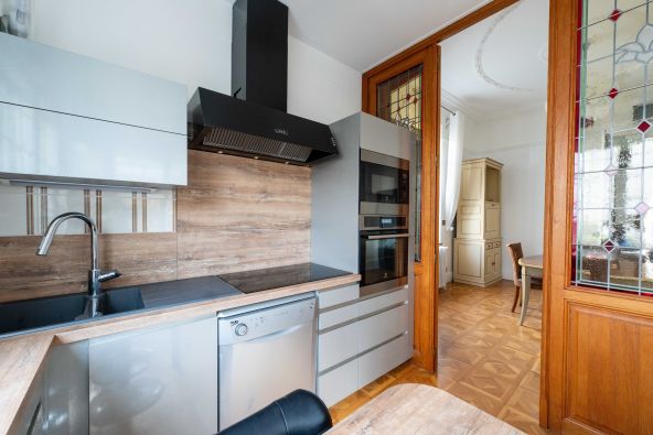 The sun-filled living room, enhanced by a magnificent bow window, opens onto a warm dining area and a perfectly equipped open kitchen. A discreet laundry room and guest WC complete this level.