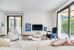 Behind its private entrance, the spaces unfold naturally. The bright living room, opening onto a private garden, creates a seamless flow between indoor and outdoor living, enhanced by a glimpse of the sea.